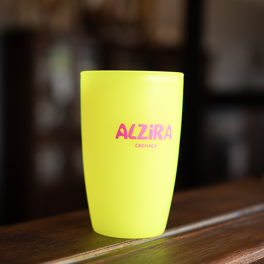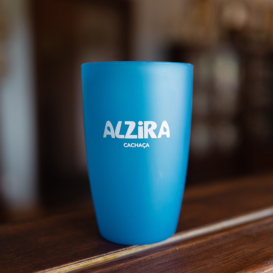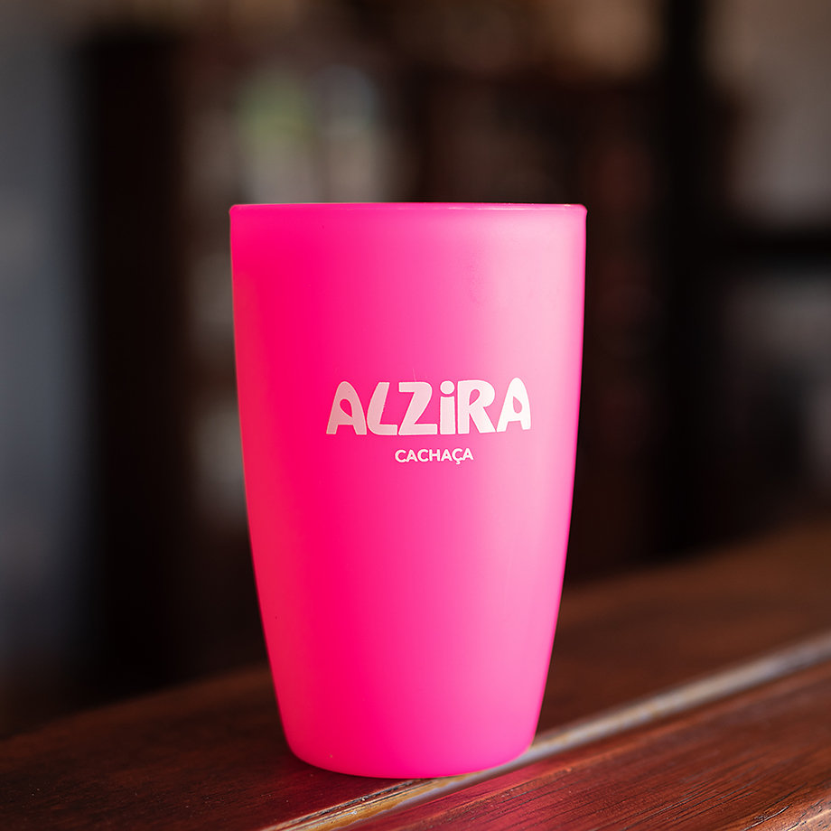 Copo de plástico duro de qualidade com o logo de Alzira Cachaça impresso em silk.